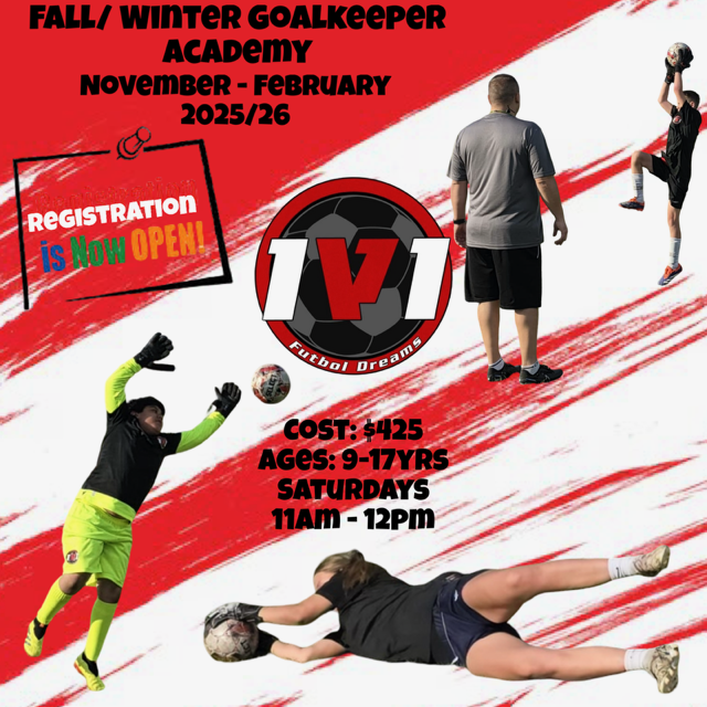 The 1V1 Futbol Dreams Goalkeeper Academy is designed for children 9 - 17yrs focusing on the fundamental techniques layered with the physical, tactical and psychological demands of the position. Improve performance, reflexes and strength using innovative learning methods in a fun, safe and inclusive environment.